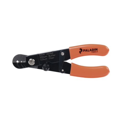 The PA1162 is Tempo Communications 3-Level Fiber Optic Stripper. This tool is for stripping 2.0 to 3.0 mm fiber optic cables and features bright orange rubber handles with a locking mechanism for safety and transport.